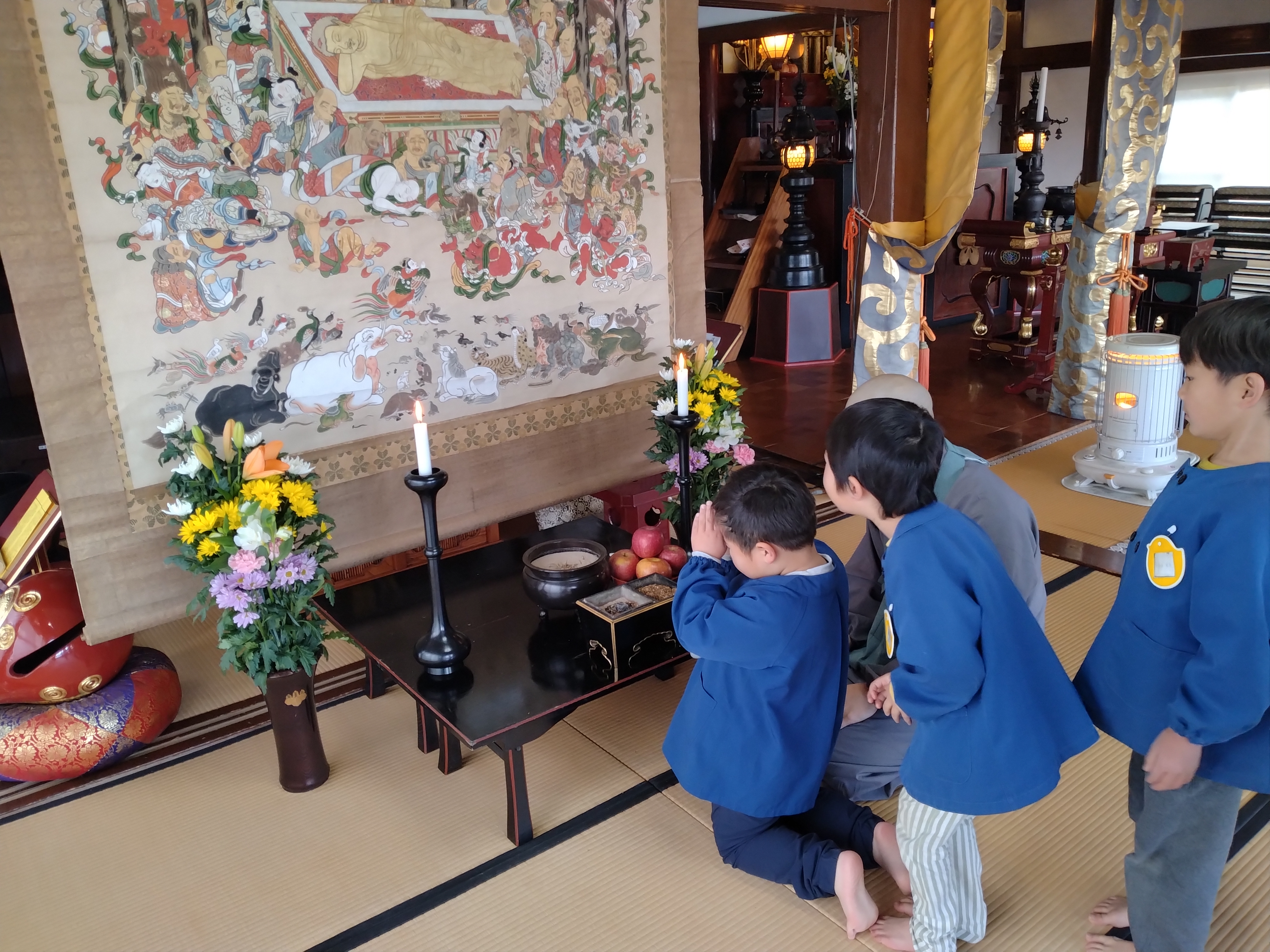 涅槃図について住職が簡単にお話しし、副住職がやり方を教えて園児が一人一人お焼香しました。