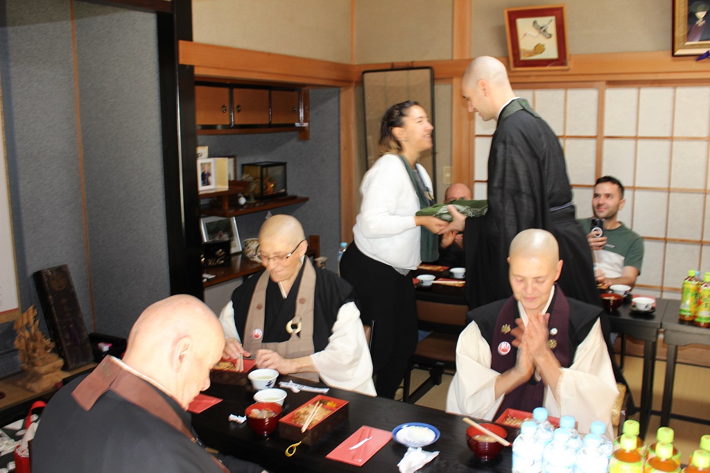 客殿では、5年前に永隣寺に来たことのあるアレッサンドロ秀一さんへ婚約者のエリザベッタさんから手縫いの袈裟がプレゼントされ、皆から祝福の拍手を受けていました。