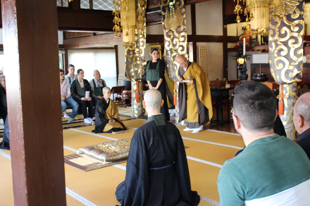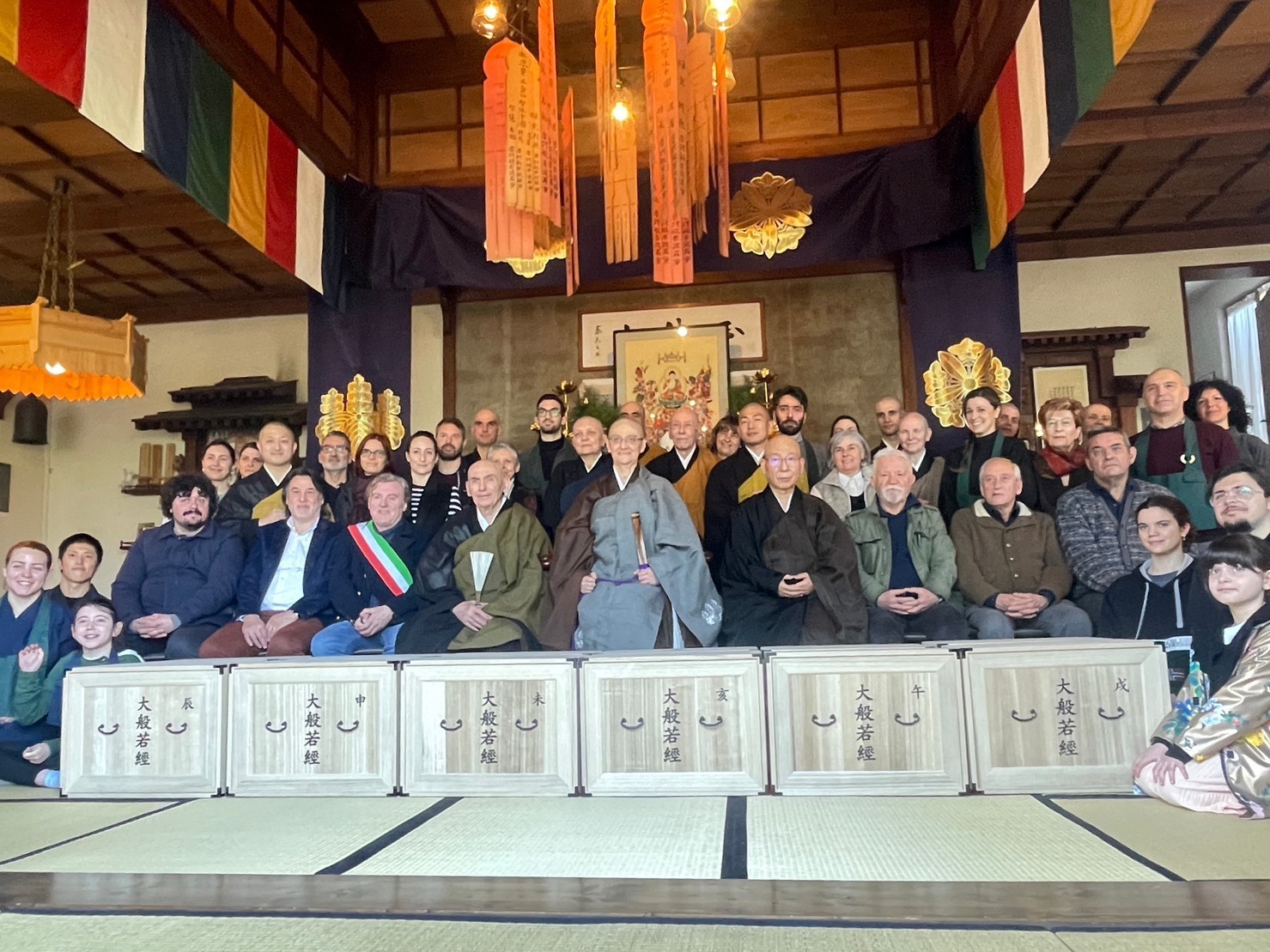 『大般若経六百巻』が無事イタリア普伝寺に到着。永隣寺副住職の堀口智玄と長年寺副住職の喜美候部峻正さんがこれに合わせて渡欧し、曹洞宗ヨーロッパ総監部総監峯岸正典老師と現地で合流し、大般若経の引き渡しと大般若経を使ってのご祈祷の仕方を指導しました。