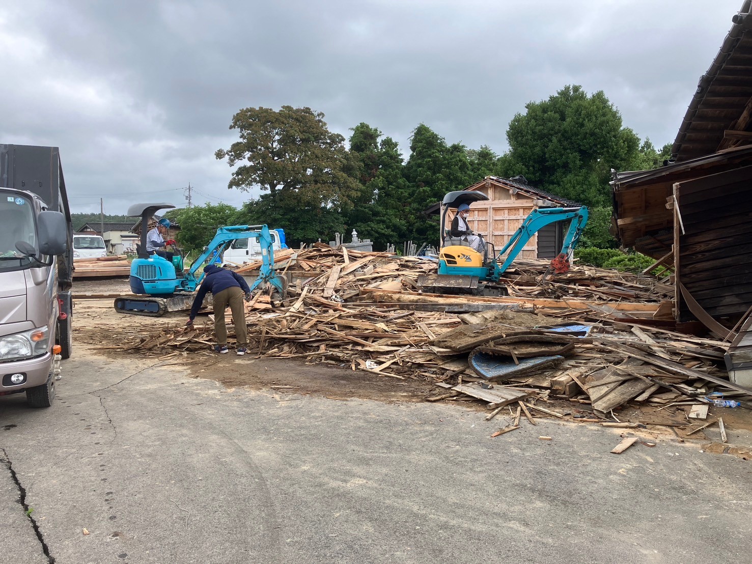 手作業で仕分けしながら2台の重機で瓦礫をダンプに積み込み、集積場まで運びました。