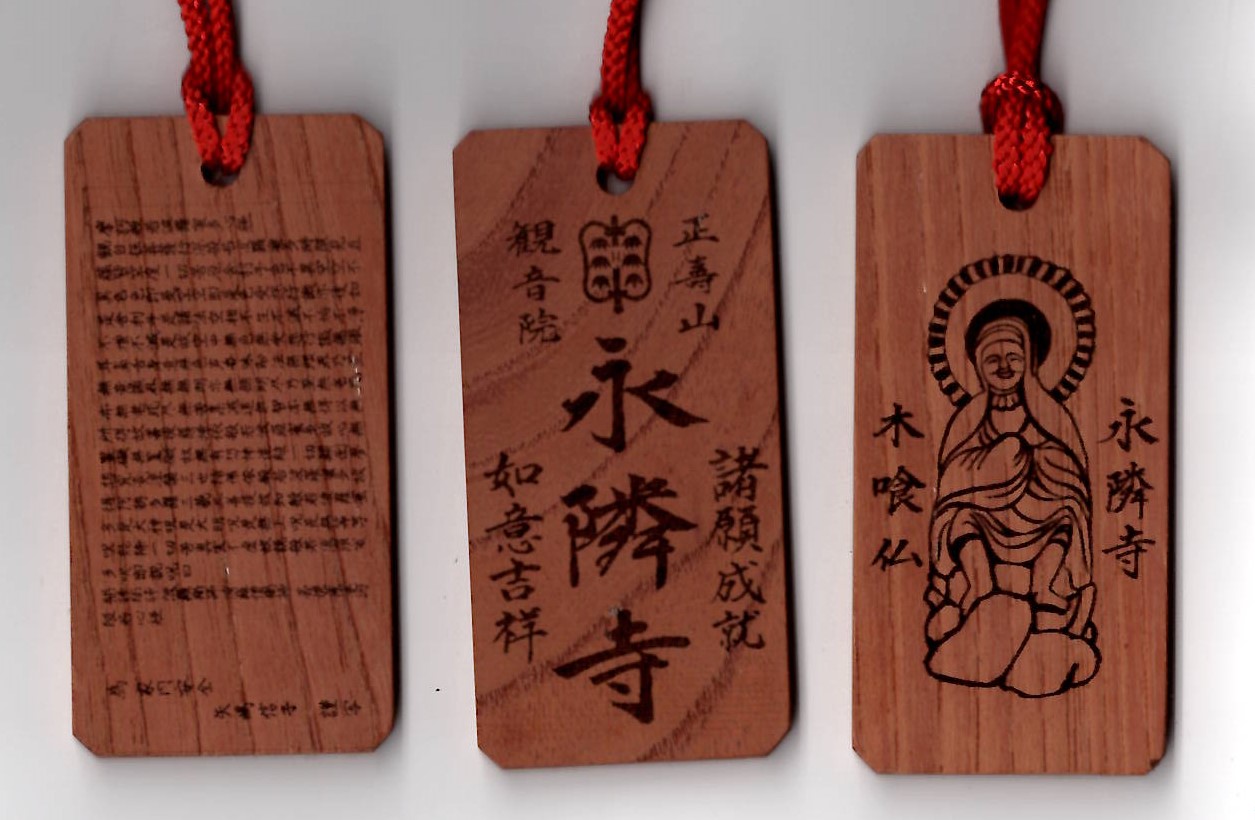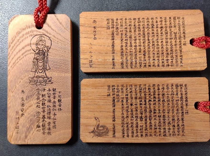 中央が永隣寺の寺紋を入れた御守り木札の表面です。右は木喰仏を描いて入れたものです。左が写経会参加者が願いを込めて写経したものです。