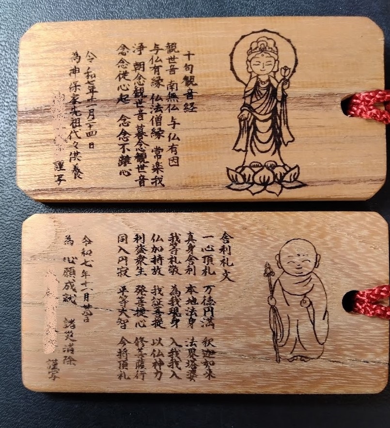 今度はその木から、縦8cm・横4cm・厚さ5mmの木札をたくさん作りました。永隣寺では月1回写経会を行っていますが、写経参加者にそれぞれの願いを込めて「般若心経」を写経してもらい、それを小さな木札にレーザー彫刻機で刻字し、世界に一つだけの「御守り」を作ってお渡ししました。