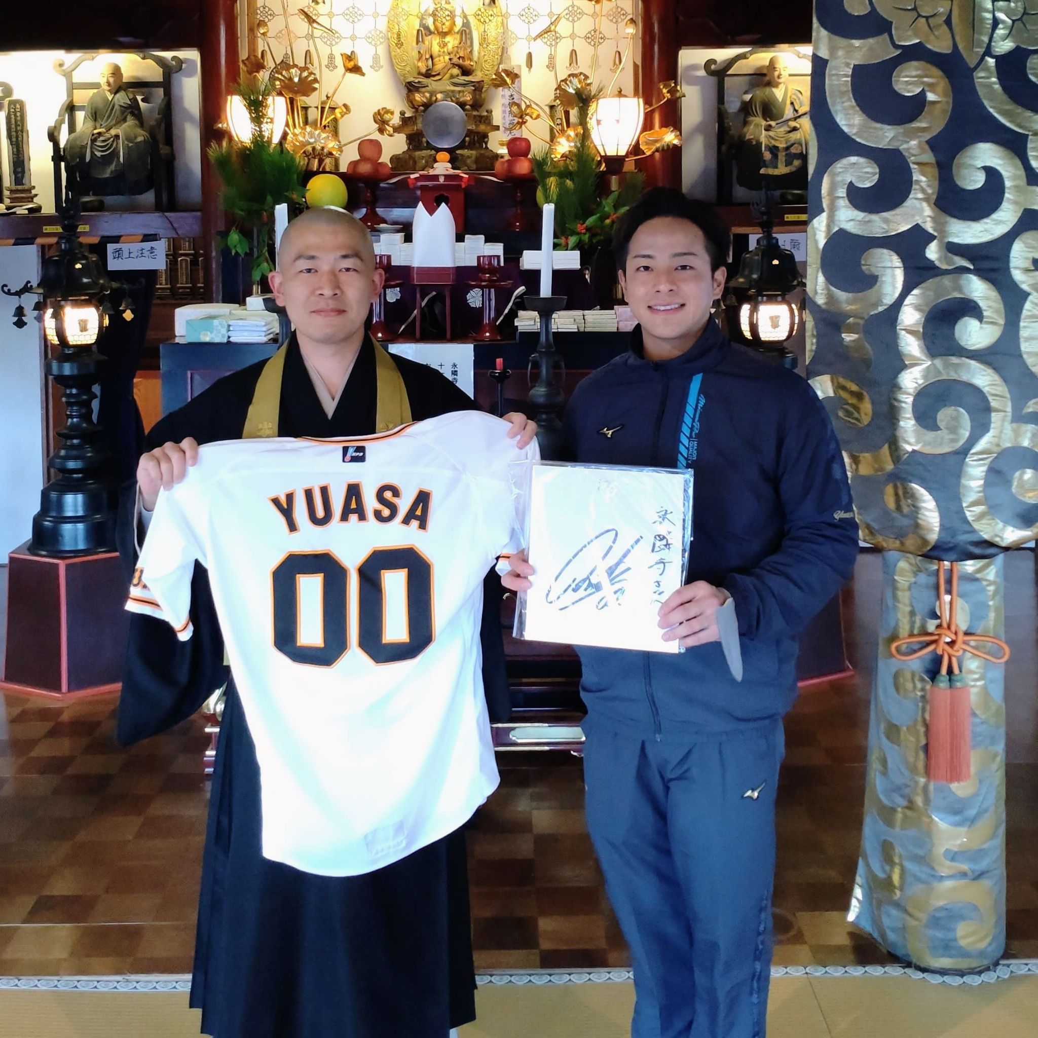 地元出身の読売ジャイアンツの湯浅大選手が家族で年賀の挨拶に来ました。背番号00のユニフォームとサイン色紙をいただきました。今年も一軍で去年以上に活躍されることをお祈りいたします。
