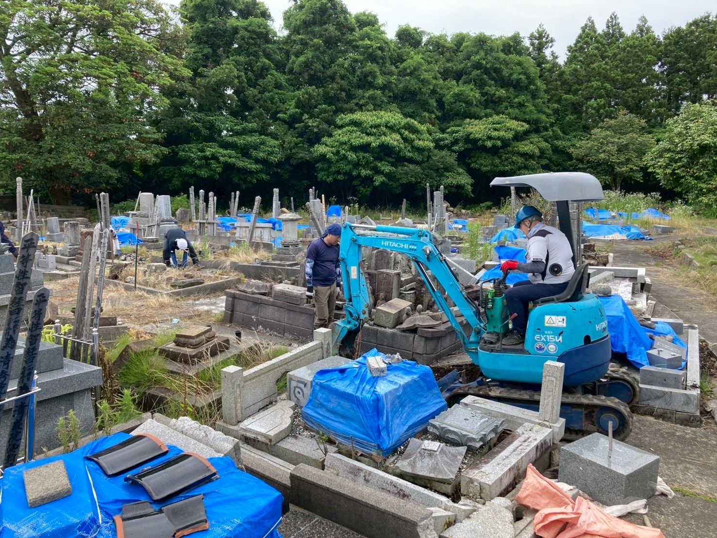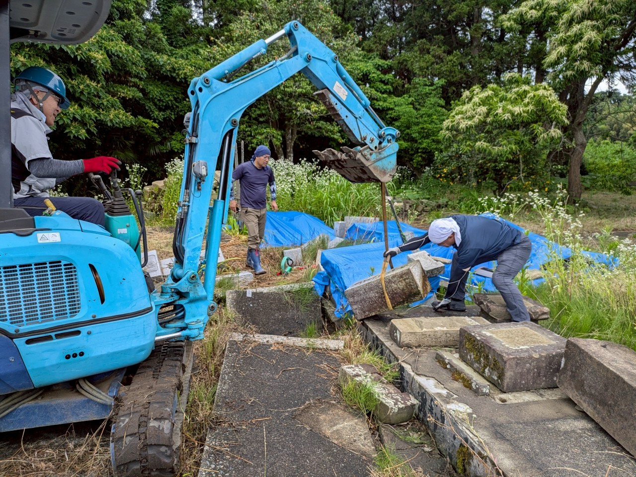 支援活動の場所は、昨年と同様に珠洲市の千光寺と能登町の萬福寺でした。能登地方の墓地の石塔は、いまだに多くが地震で倒れたままになっています。千光寺では、檀家さんが自分の家の墓まで歩いて行くことさえ困難なほど通路がズタズタでした。そこで群馬から小型の重機を運び、通路をふさぐ墓石を移動したり、場所によっては通路のコンクリートを剥がして砕石を敷いて平らにしたりするような作業をしました。