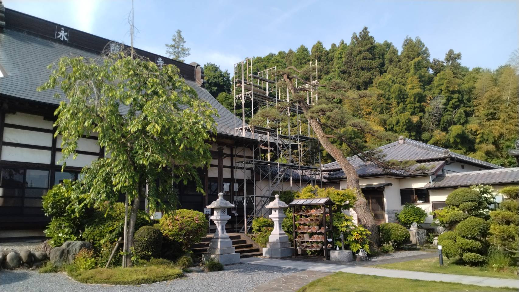 黒松が本堂側に大きく伸びすぎて手入れができなくなってきました。足場を設置して上部を切り詰めました。しばらくの間、かっこうが悪いかもしれませんが、しばらく辛抱です。