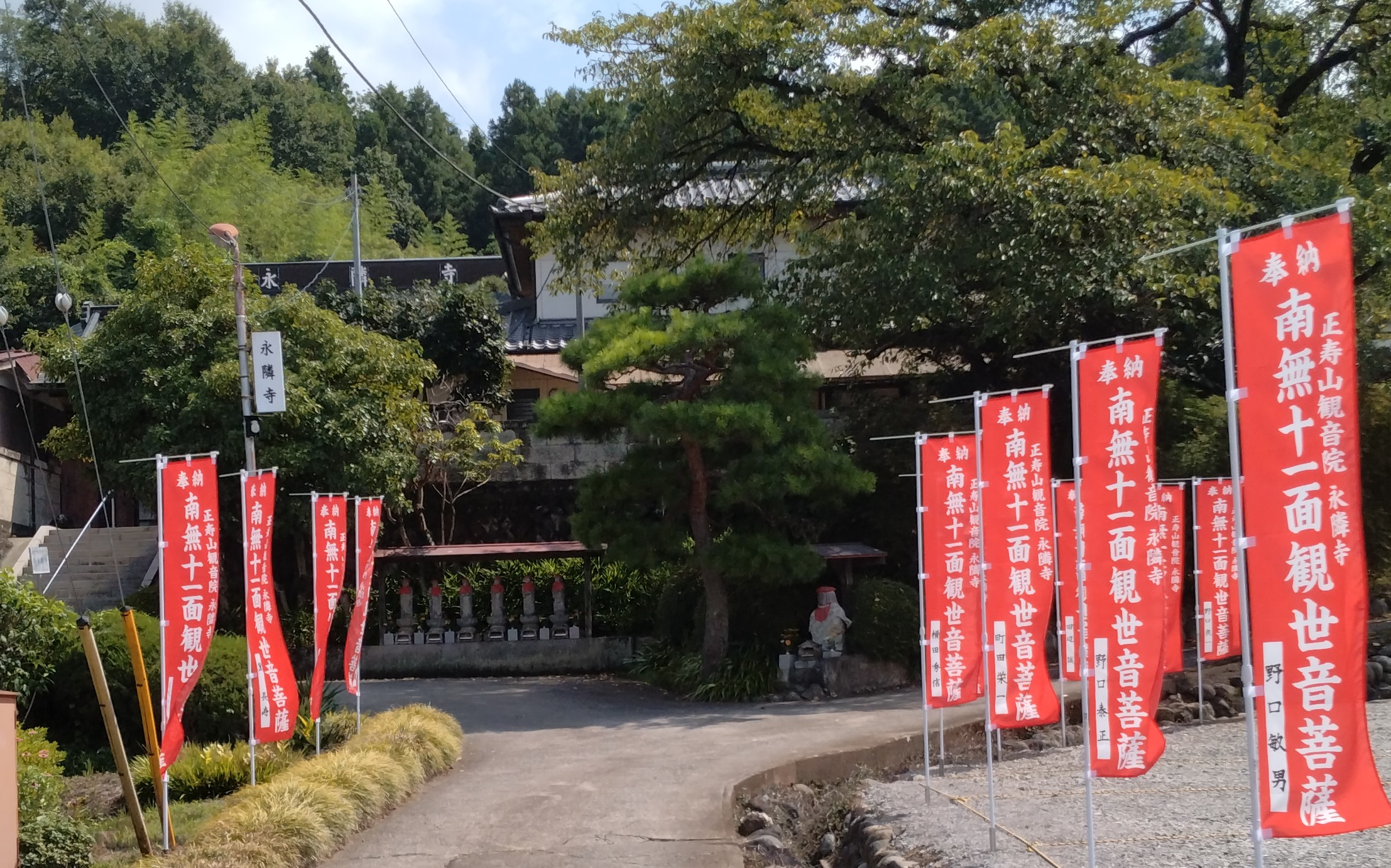 駐車場から境内への参道に御本尊十一面観音の「のぼり旗」を立て始めました。一本3000円ほどの志納金を納めていただき、奉納された方のお名前等を記載させていただきます。ご希望の方は、寺までお申し出ください。